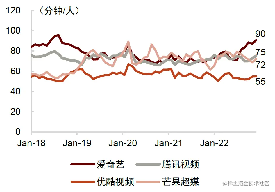 2022第三季度,爱奇艺营收成本为57亿元,同比下降19%,其中内容成本为43亿元,同比下降18%,但环比增加超过10%。然而,爱奇艺2022年年均用户单日使用时长同比增长11.5%,云合数据显示,2022年爱奇艺剧集正片和剧集会员内容有效播放份额分别同比提升3.0和6.1ppt。