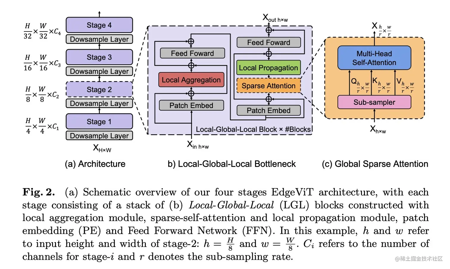 在这项工作中,作者深入到Transformer Block,并引入了一个比较划算的Bottlneck,Local-Global-Local(LGL)(图2(b))。LGL通过一个稀疏注意力模块进一步减少了Self-attention的开销(图2(c)),实现了更好的准确性-延迟平衡。