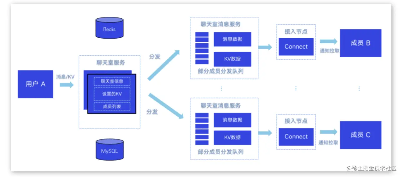 必达是对聊天室属性性能的核心要求,也就是业务所设置的属性能够稳定同步、不丢不乱,这其实考验的是整体的聊天室系统架构。
