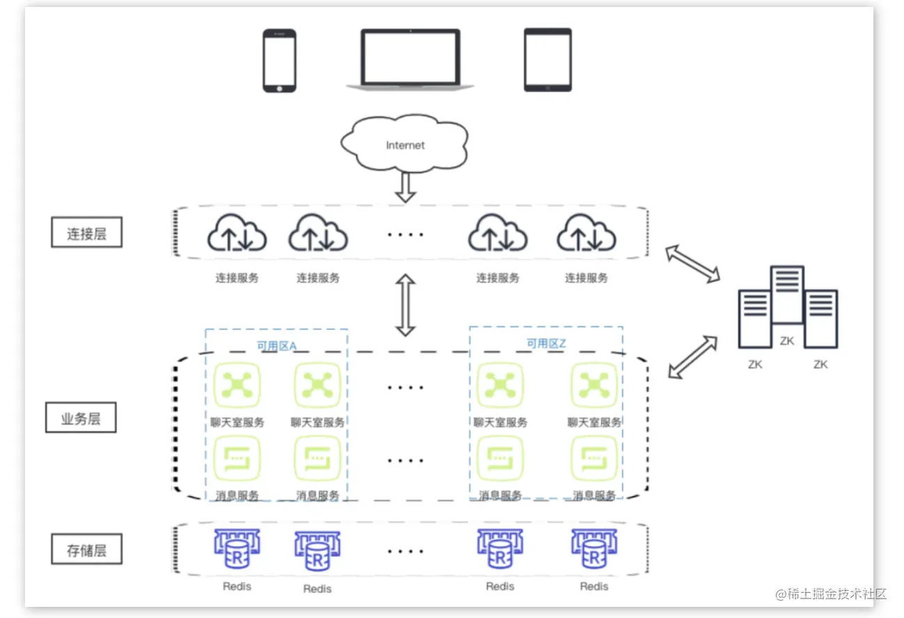 融云聊天室的系统架构如下图示,通过连接层、业务层、存储层的长连接、二级缓存、多活数据中心等方式保证响应速度和分发速度。