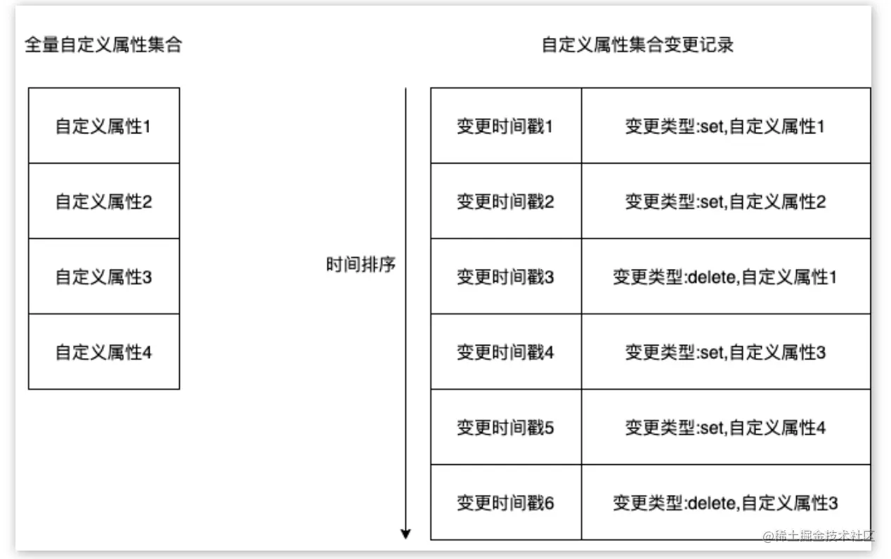 聊天室属性是以 Key 和 Value 的形式进行传递和存储的,属性的操作行为主要有两种:设置、删除。服务器存储属性也分两部分,分别是全量的属性集合,以及属性集合变更记录。如下图所示: