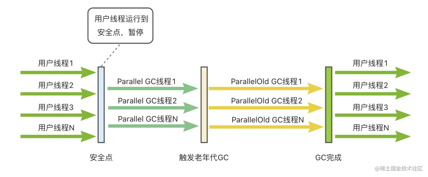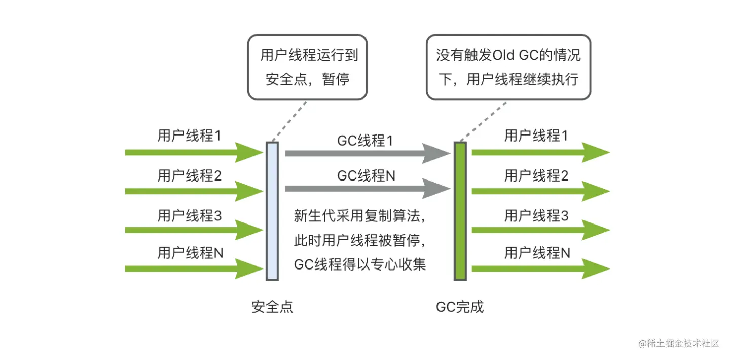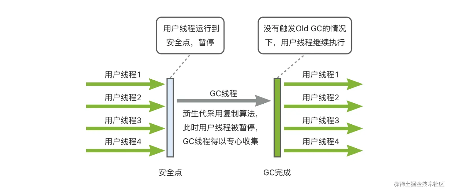 虽然历史久远,但它依然是HotSpot虚拟机运行在客户端模式下,或者4核4GB以下服务端的默认新生代收集器,这种核心数和内存空间较小的场景下,它单线程的优势就体现出来了,没有线程交互的开销,加上内存空间不大,单次回收耗时几十毫秒,这点停顿时间,完全是可以接受的。