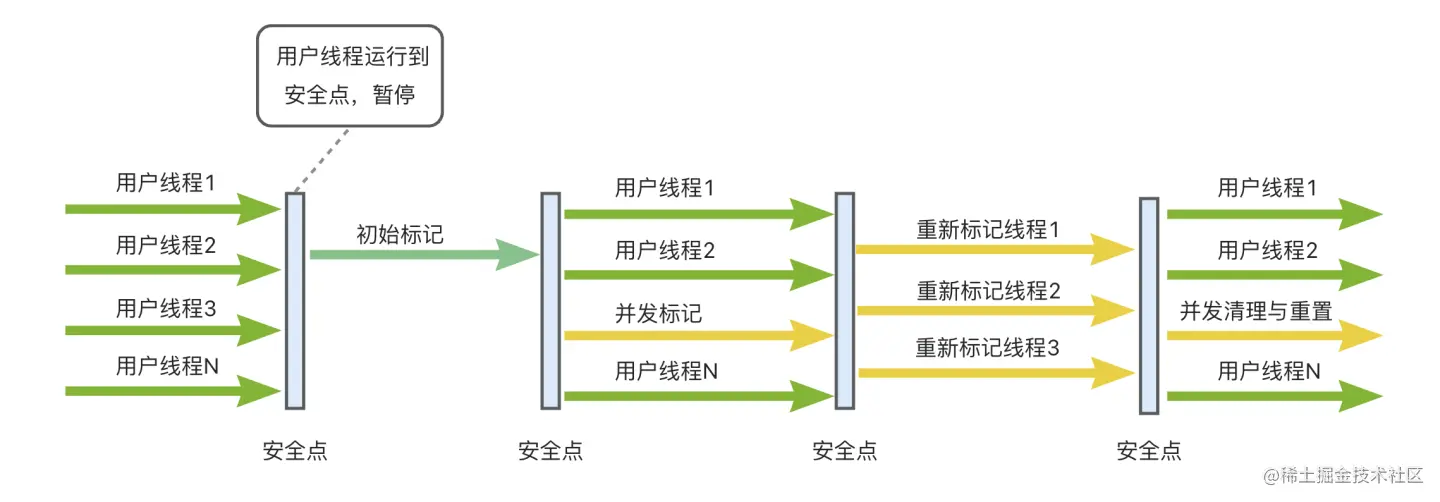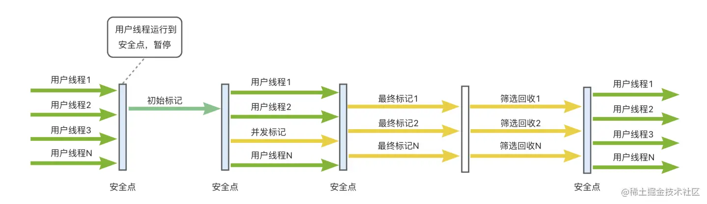 从根节点(GC Root)开始,顺着引用链遍历整个堆,找出存活的对象。这个步骤耗时较长,但用户线程可以和GC线程并发执行。