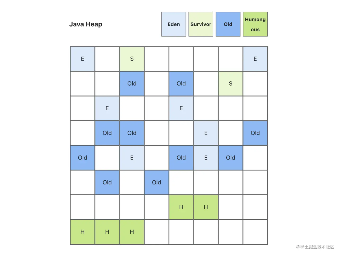 G1 依然遵循分代回收的设计理论,但它对堆(Java Heap)内存进行了重新布局,不再是简单的按照新生代、老年代分成两个固定大小的区域了,而是把堆区划分成很多个大小相同的区域(Region),新、老年代也不再固定在某个区域了,每一个Region都可以根据运行情况的需要,扮演Eden、Survivor、老年代区域、或者Humongous区域。