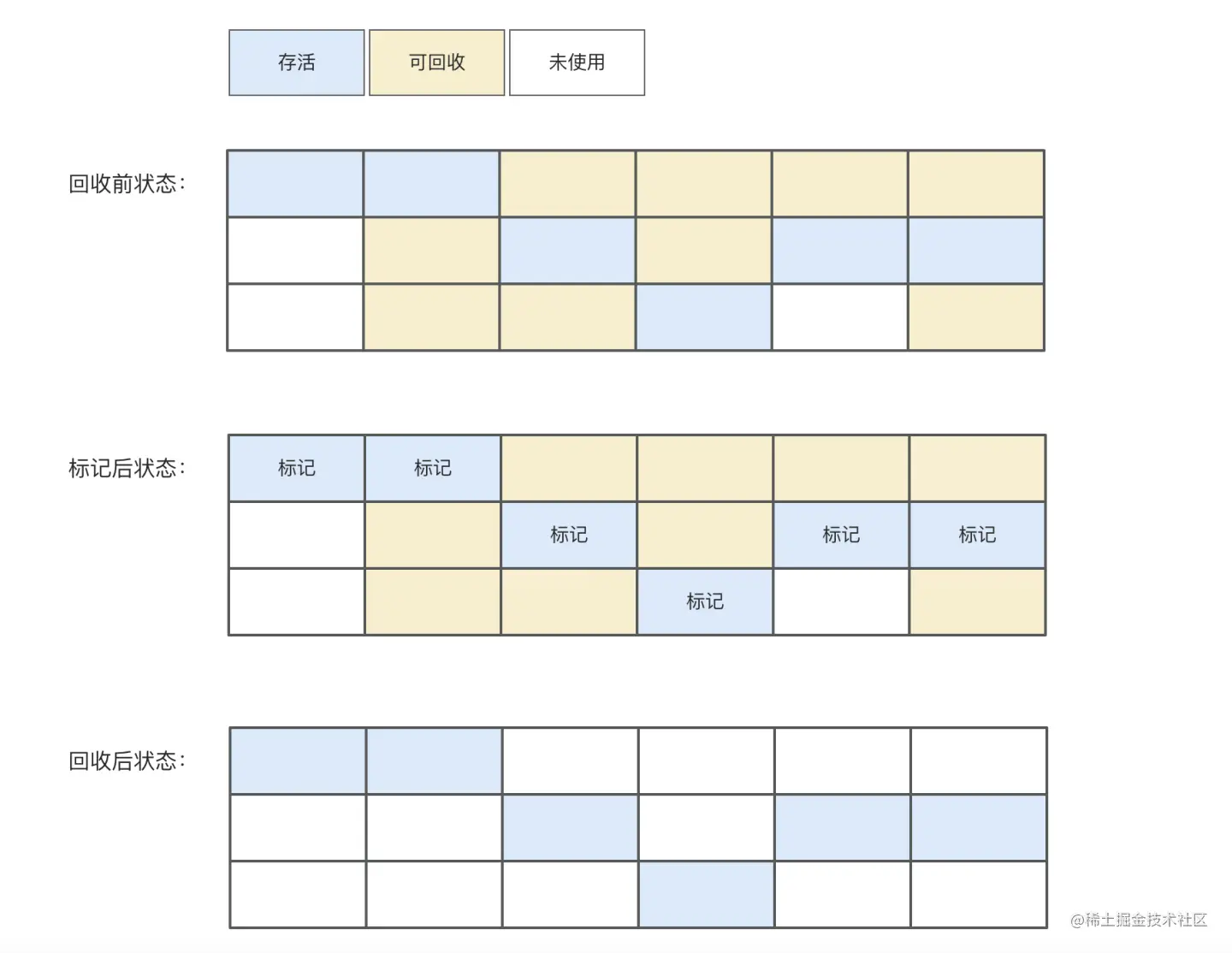 标记“存活”的,还是标记“可回收”的,网上各种说法都有,我个人理解,是标记存活的。这样效率高些。