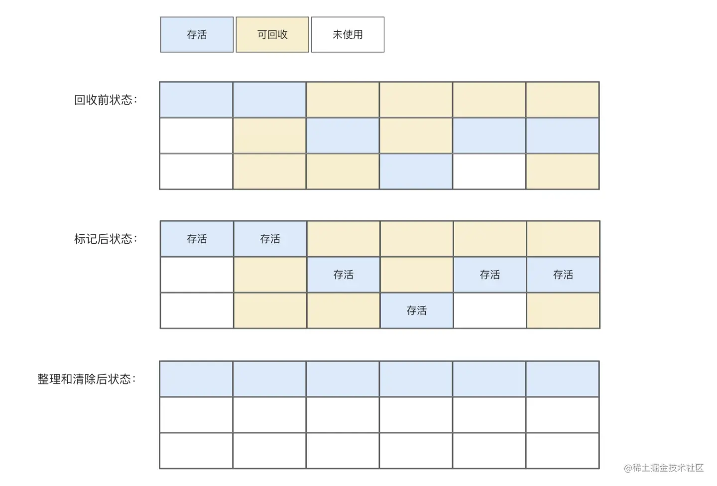 标记-清除算法会产生内存碎片,不适合哪些需要大量连续内存空间的场景,而标记-整理算法,就是在其基础之上,增加了整理这个操作,去解决这些内存空间碎片化的问题,如下图所示: