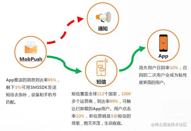 App 外的信息可以借助 SMSSDK 营销短信来触达,借助 App 内的 MobPush 消息推送,加上同步的短信推送和邮件推送通过 MobLink 深度链接可以让用户直接从接触的信息进入到 App 内部进行操作,提升用户体验的流畅性。如果没有 MobLink 深度链接,用户需要退出当前应用程序,在商城寻找并且下载 App,然后打开 App,再在 APP 内部查找相关的内容,用户的操作流程过长只能呈现出低转化率和打开率。