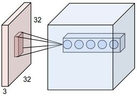 该图像显示每个神经元(立方体中的一个圆)都连接到输入体积中的局部区域,或者换句话说连接到一个补丁。该图像显示了沿深度的 5 个神经元,它们中的每一个都对应于一个不同的过滤器,但查看相同的输入块(即它们具有相同的感受野)。