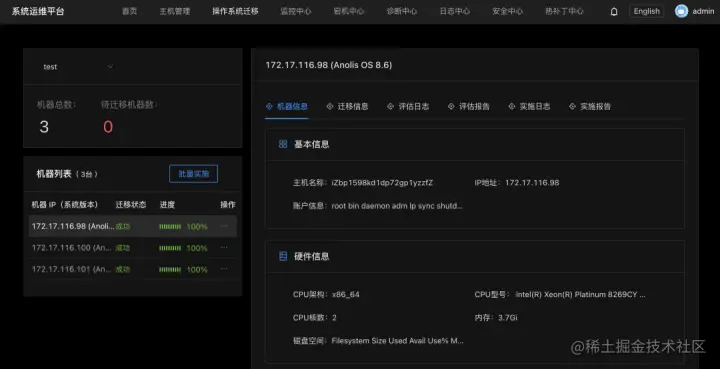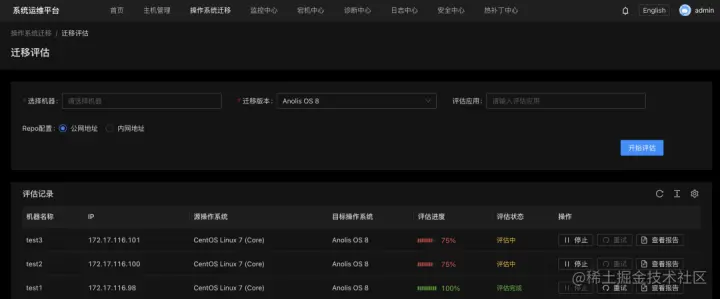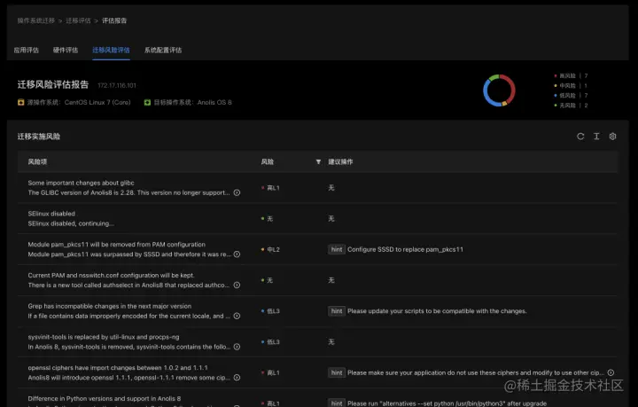 迁移评估:在操作系统进行迁移之前,通过自动化的迁移评估功能,用户可以了解迁移后的 Anolis OS 对原有系统的兼容性,包括软件兼容性和硬件兼容性,同时会为用户提供详细的兼容性报告,为后续迁移到 Anolis OS 做充分的信息决策的准备。