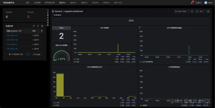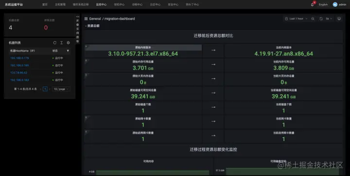 SysOM 2.0 新增迁移监控报表功能,该项功能对迁移前后系统的资源总额使用情况、基础指标变化趋势以及指标波动等进行采集和可视化展示,可以让用户更加直观地感受迁移前后,操作系统的变化情况。同时,通过在迁移前后运行一段时间测试任务,可以对实际业务在两种操作系统上运行的性能有一个直观的对比效果。