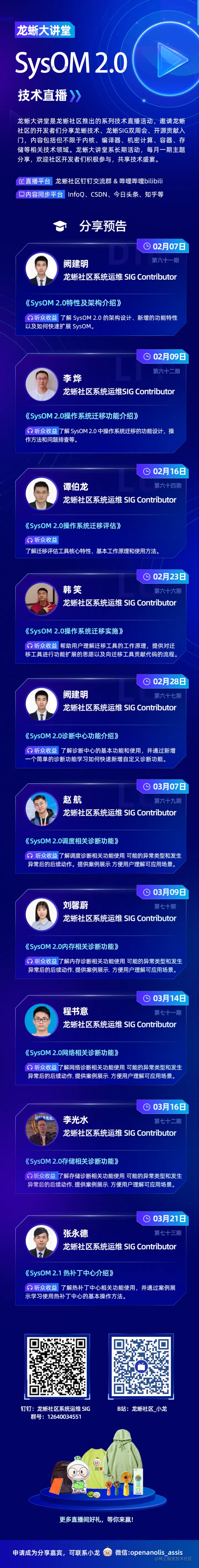 直播预告: 周二(今天)16:00-17:00 ,龙蜥社区邀请了系统运维 SIG Contributor 阙建明分享《SysOM 2.0 特性及架构介绍》,带大家了解 SysOM 2.0 的架构设计、新增的功能特性以及如何快速扩展 SysOM。快来扫描海报二维码入群,预定前排小板凳观看直播!
