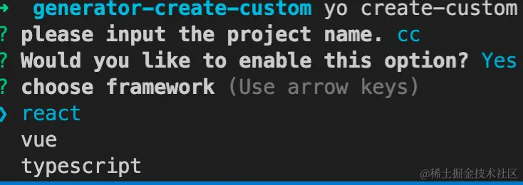choices: ['react', 'vue', 'typescript'],