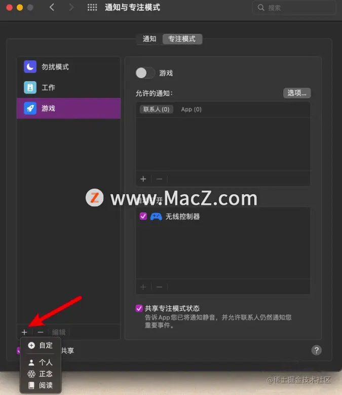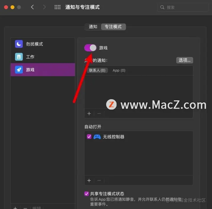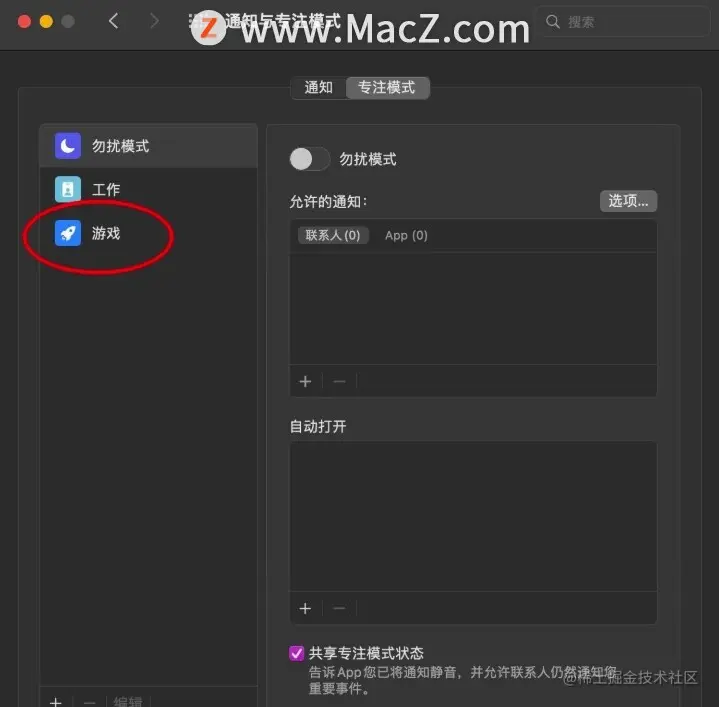 4、右边的“游戏”的开关,即可开启。在专注模式没有,游戏的需要添加。