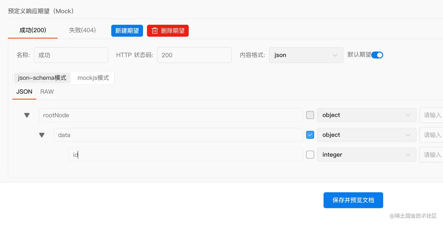 我们可以通过在 API设计模块 - 预定义响应期望 - json-schema 预先定义接口的数据返回格式。如下图: