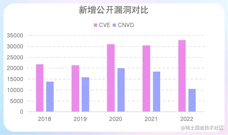 在2022年,CVE新公开的漏洞数量为33034个,达到新高。而CNVD公开的漏洞数为10651个,则有所下降。(CNVD的漏洞默认是在收录一年后公开,所以并不能完全反映当前漏洞趋势)