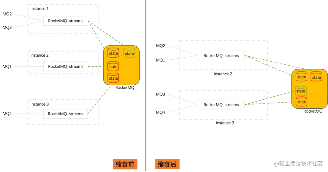 RocketMQ作为消息临时存储,存在数据最大过期时间,一旦过期后,数据会被删除。但是状态存储介质本质上是以KV方式存储数据,不希望KV数据随着时间过期而被删除。因此,使用Compact topic作为状态存储,他会对同一队列的数据按照Key对数据进行压缩,相同Key的数据只保留offset最大的一条。
