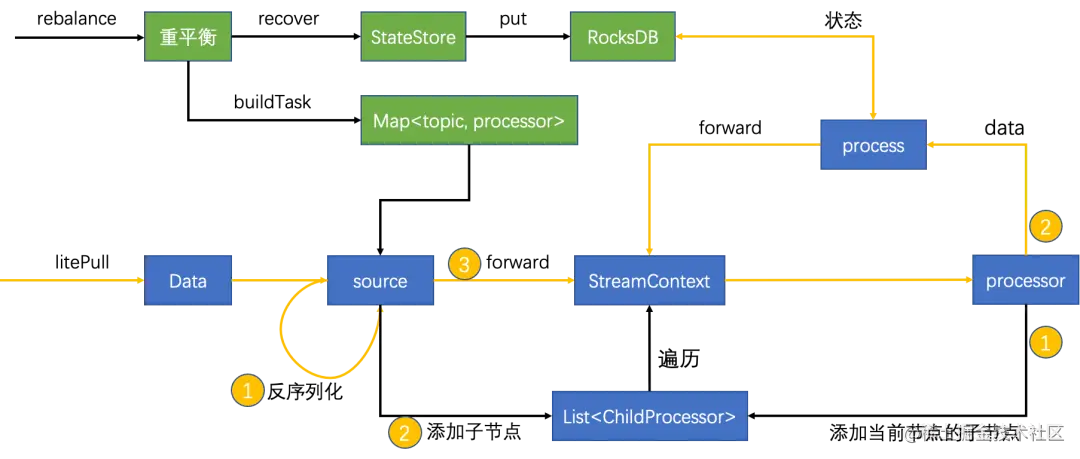- 数据处理,如果有状态算子则与RocksDB交互,如果还有下游节点则继续进入StreamContext,如果没有下游节点则结束处理。