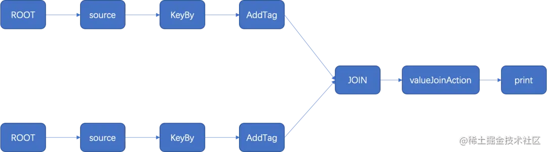 在左流和右流上添加KeyBy算子,对左流和右流进行分别过滤;之后在左流和右流上分别添加标签节点,标记此数据是左流还是右流,之后将两个标签节点,指向一个共同的Join节点,数据在此完成汇聚,按照使用者给定的ValueJoinAction节点处理。