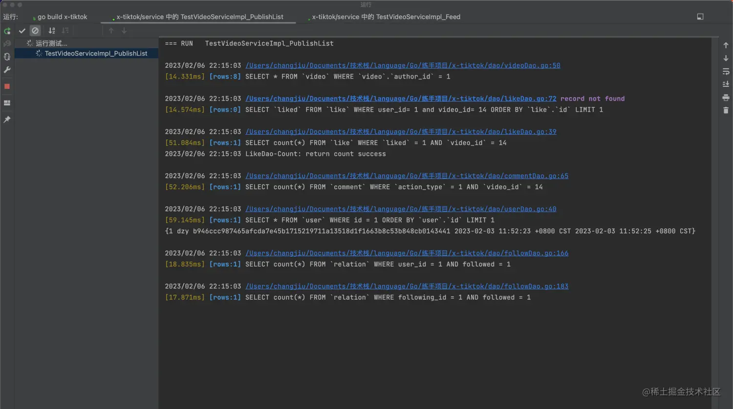 结合上面的代码可以看到,videoService需要用到likeService里的方法,likeService需要调用videoService方法,所以会导致循环依赖,体现在代码层面我感觉是阻塞,或者说是死锁,下面图片videoService里调用likeService的函数测试卡住了。videoService卡在likeService的调用处,当我在此处不再调用likeService里的方法,测试就可以通过。但需要调用仍然未解决!