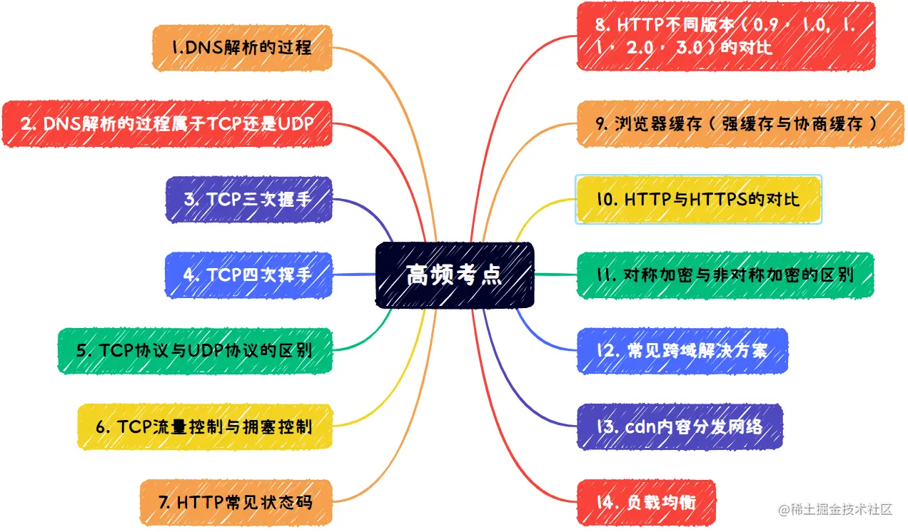 1-5步都是计算机网络和http通信的相关知识点,汇总下来大致包含以下一些高频且必须掌握的内容: