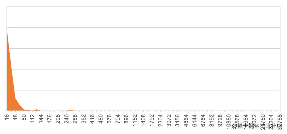 横轴是对象大小,纵轴是数目,可以看到绝大多数对象都小于 80 B。因此优化小对象分配是关键。