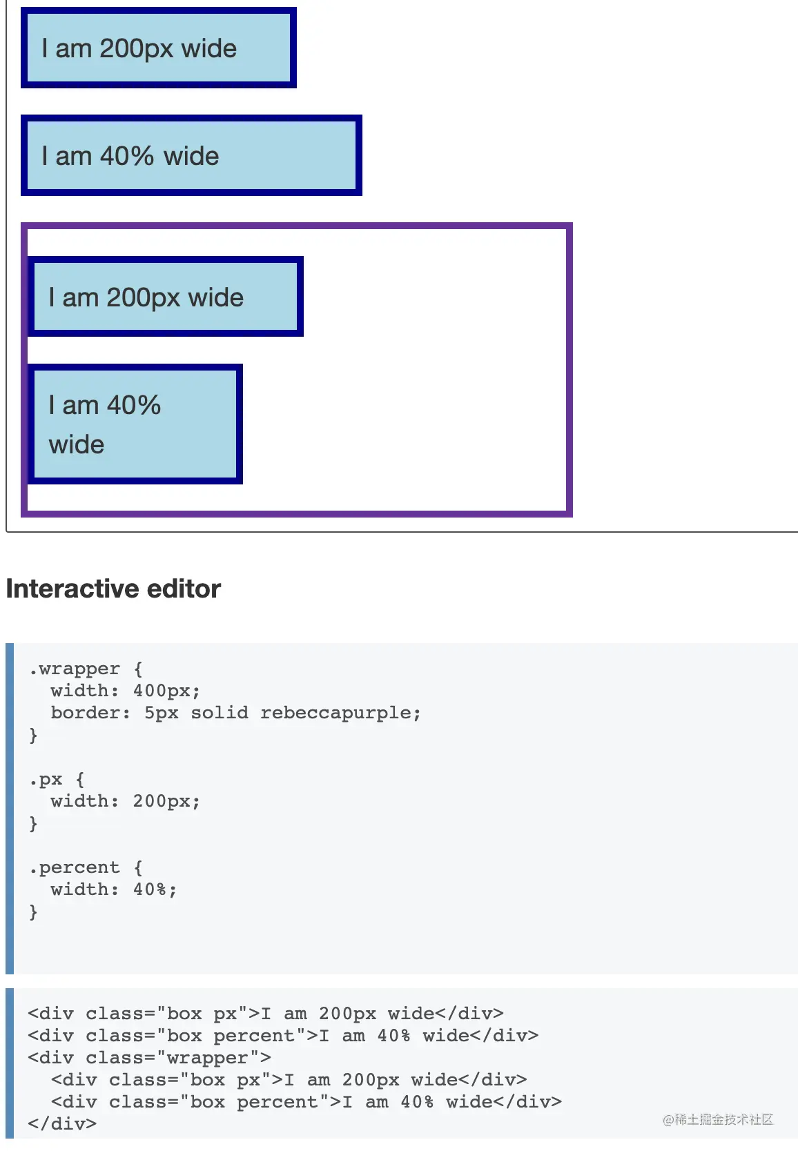 不同之处在于,第二组两个框位于一个 400 像素宽的包装器中。第二个 200px 宽的盒子和第一个一样宽,但是第二个 40% 的盒子现在是 400px 的 40%——比第一个窄多了!