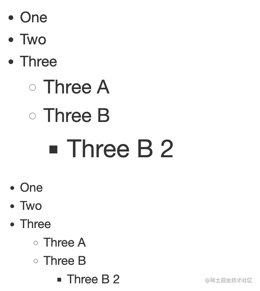 HTML 是一组嵌套的列表—我们总共有三个列表,并且两个示例都有相同的 HTML。唯一的区别是第一个类具有 ems,第二个类具有 rems。
