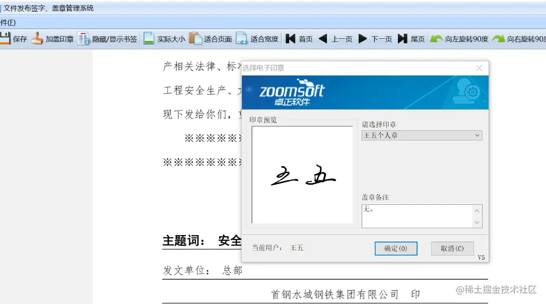 登录成功后有选择王五的个人章进行签字