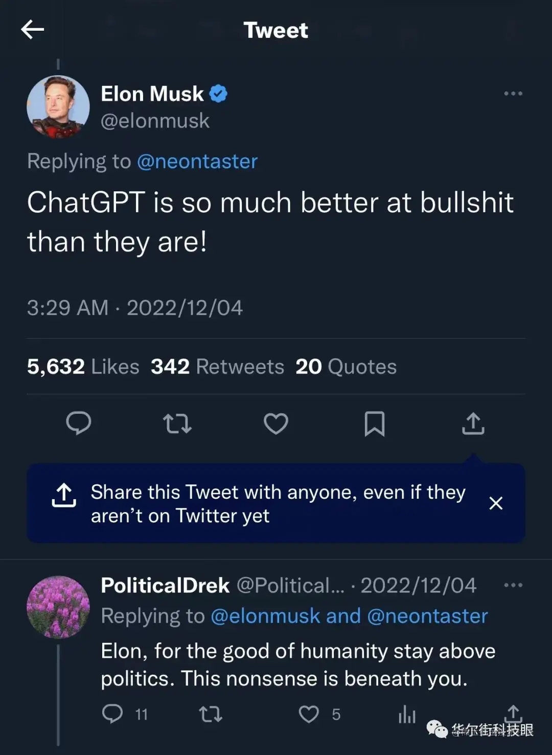 图:特斯拉创始人马斯克称Chat GPT扯淡能力最强