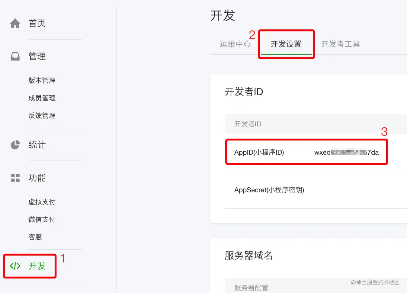 补充信息并下载开发工具后,点击下图的“开发设置”链接获取 AppID 与 AppSecret 。需要进行重置才能获得 AppSecret ,请务必妥善保管,此后若丢失则必须再次重置重新生成,会对运营中的服务造成很大麻烦。