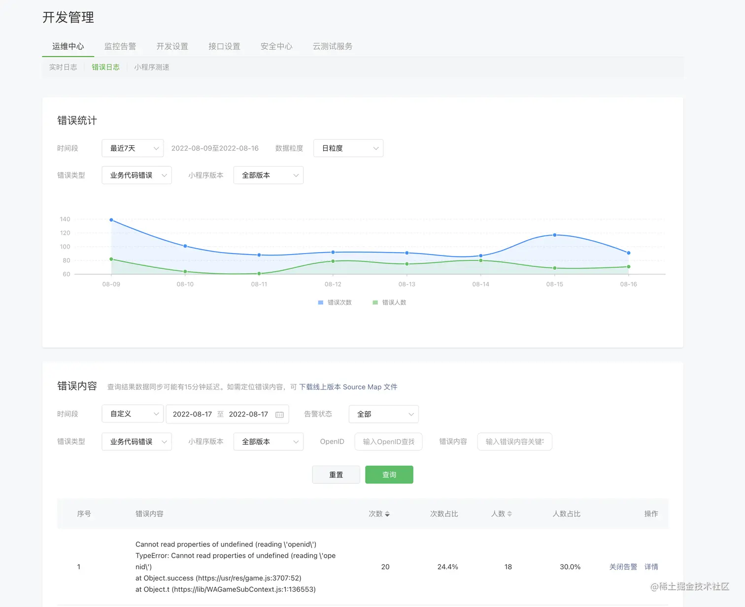 开发者可从小程序/小游戏管理后台:开发->开发管理->运维中心->错误日志,进而查看当前小程序/小游戏的错误日志信息。如图所示: