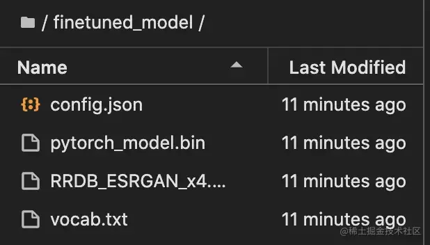 tar czf finetuned_model.tar.gz config.json pytorch_model.bin RRDB_ESRGAN_x4.pth vocab.txt