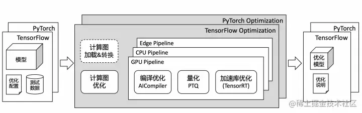 PAI-Blade采用以AI编译器为主线的技术路径,支持在多种框架、多种硬件上进行机器学习模型的优化。其核心组件BladeDISC是一款支持动态Shape的深度学习编译器,并已在GitHub开源(github.com/alibaba/Bla…)。