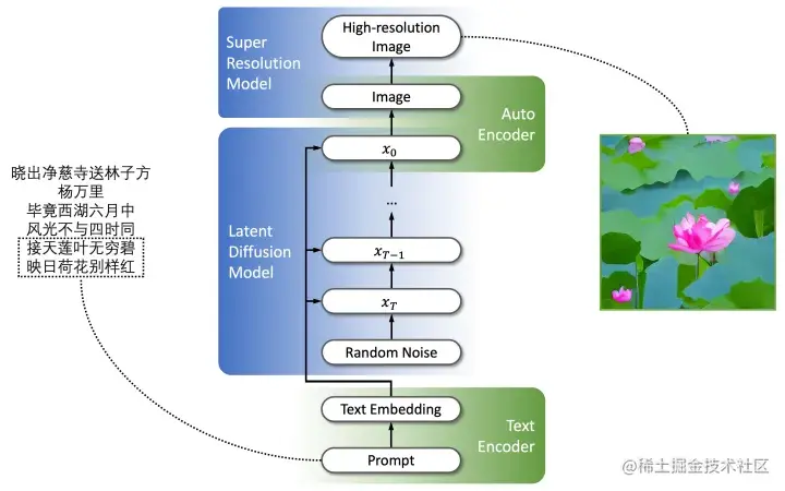 我们简单回顾一下PAI-Diffusion模型的技术架构。简单的说,PAI-Diffusion模型是面向中文的、基于隐式扩散模型(Latent Diffusion Model, LDM)的文图生成模型。因为中英文在文化和表达上具有很大的差异性,产出的模型通常无法建模中文特有的现象。PAI-Diffusion模型由阿里云机器学习(PAI)团队发布并开源,除了可以用于通用文图生成场景,还具有一系列特定场景的定制化中文Diffusion模型,包括古诗配图、二次元动漫、魔幻现实等。PAI-Diffusion的模型Pipeline架构,包括中文CLIP模型、Diffusion模型、图像超分模型等: