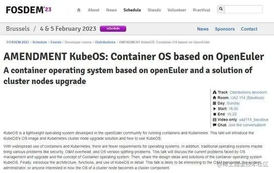 2023年2月5日,欧洲开发者峰会FOSDEM 2023在比利时布鲁塞尔举办,KubeOS的议题《KubeOS: Container OS based on openEuler》现场受到广泛关注。