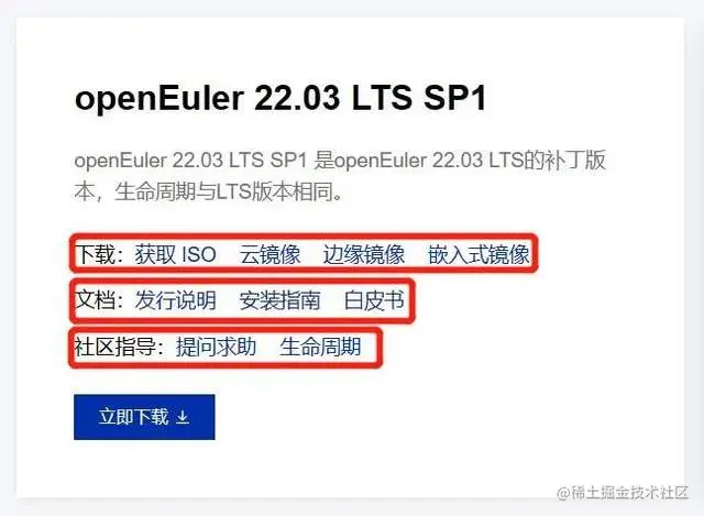 社区基础设施团队对openEuler官网下载页面的页签内容进行分类,新增下载类、文档类和社区指导类,使得整体更为清晰,便于开发者按需下载使用。