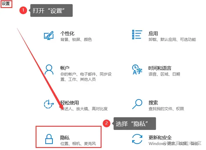 步骤2: 如果相机打不开,可以打开电脑的【设置】窗口,选择【隐私】;