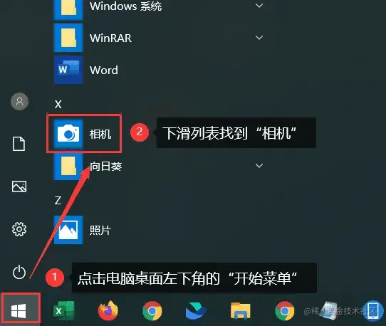 步骤1: 单击笔记本桌面的【开始菜单】,下滑列表找到【相机】,或者是在搜索框搜索【相机】,单击它就可以打开摄像头了;