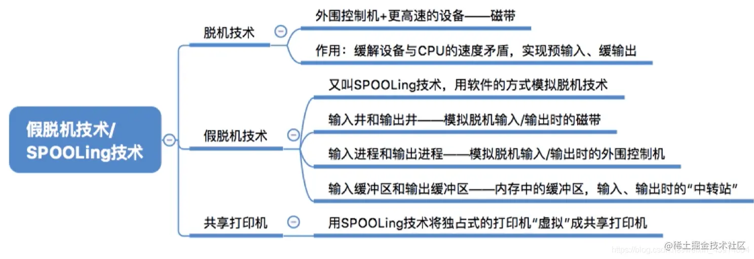 虚拟设备――采用SPOOLing技术将独占设备改造成虚拟的共享设备,可同时分配给多个进程使用(如采用SPOOLing技术实现的共享打印机)