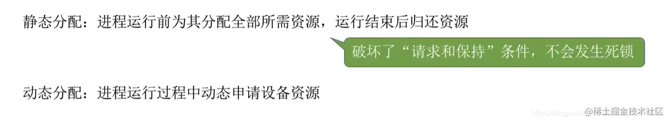 静态分配:进程运行前为其分配全部所需资源,运行结束后归还资源