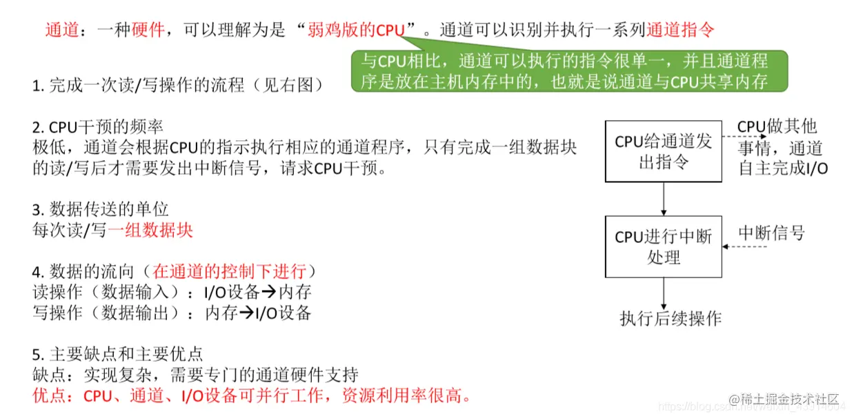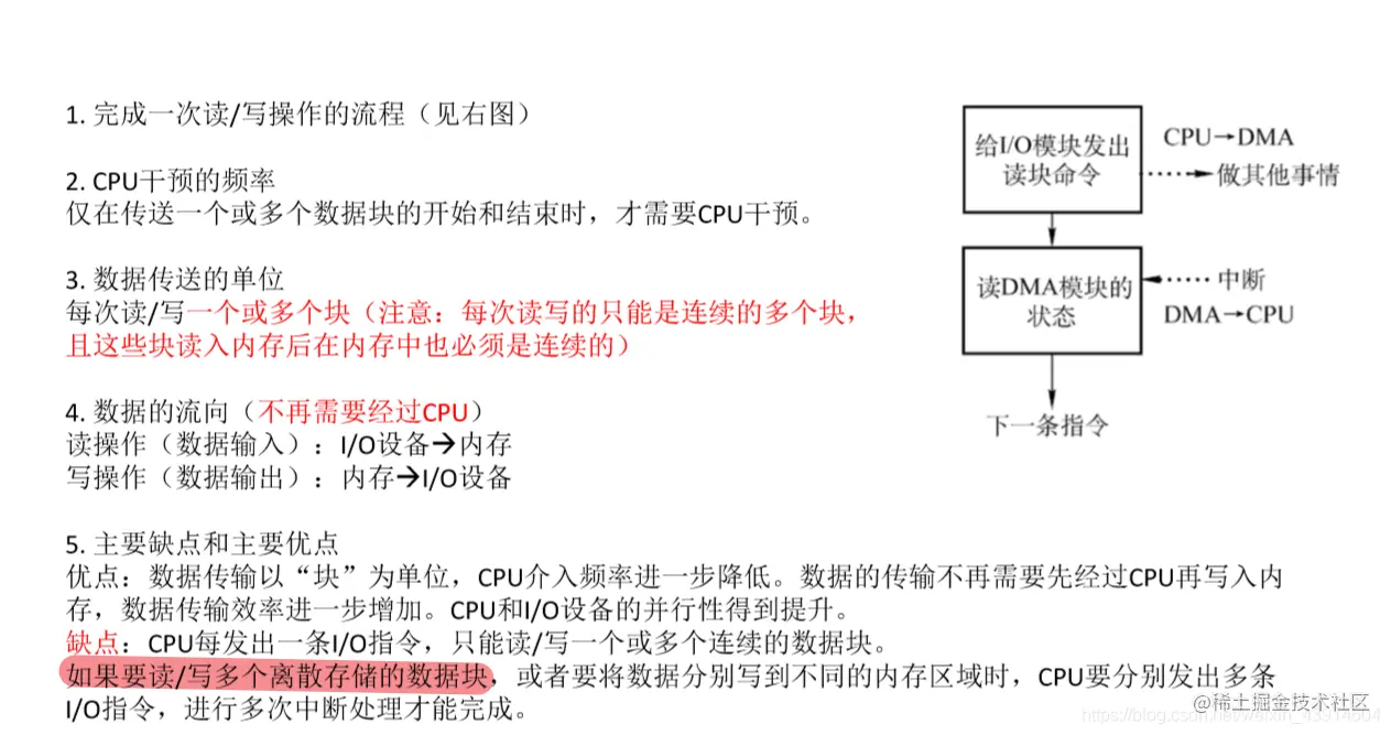 - 缺点:每个字在I/O设备与内存之间的传输,都需要经过CPU。而频繁的中断处理会消耗较多的CPU时间。