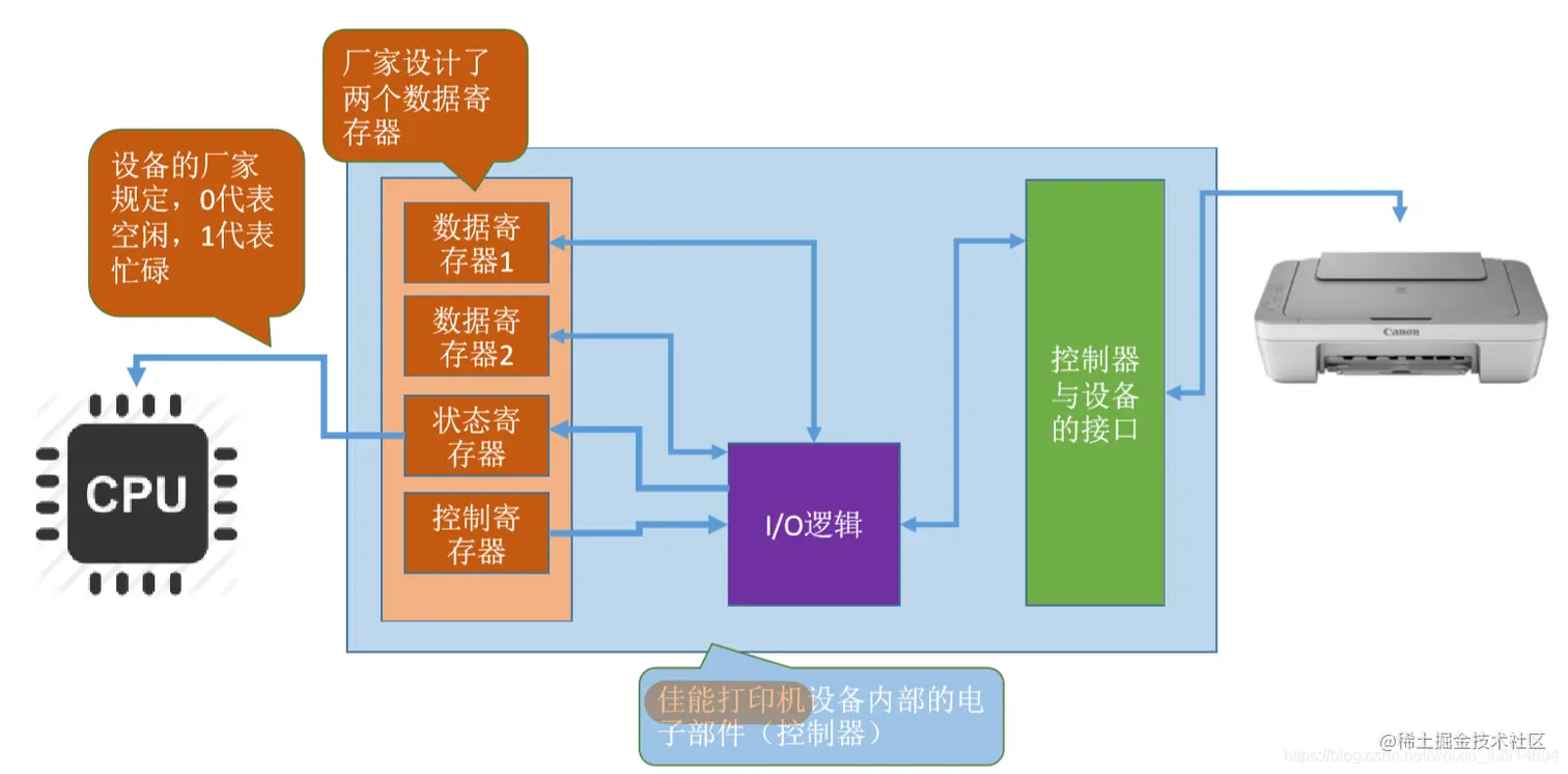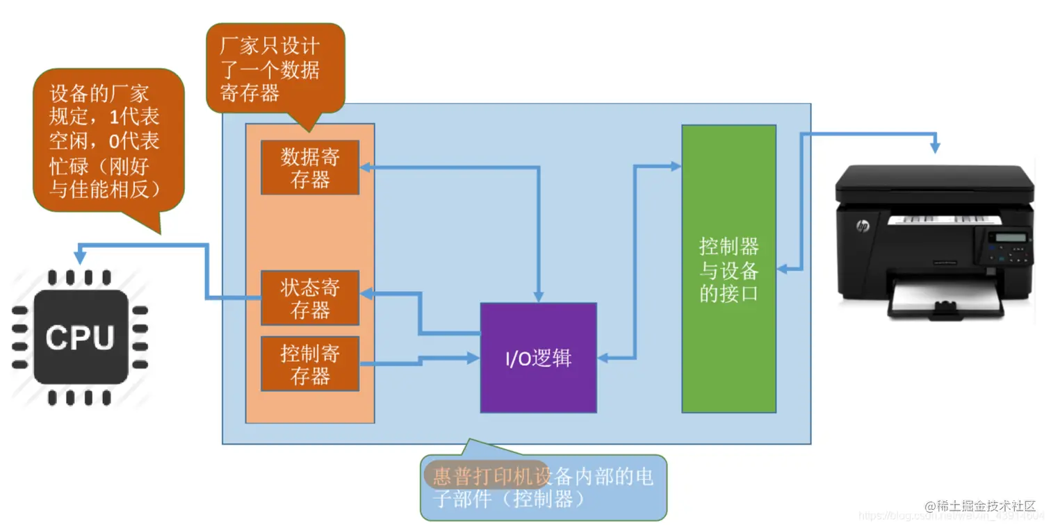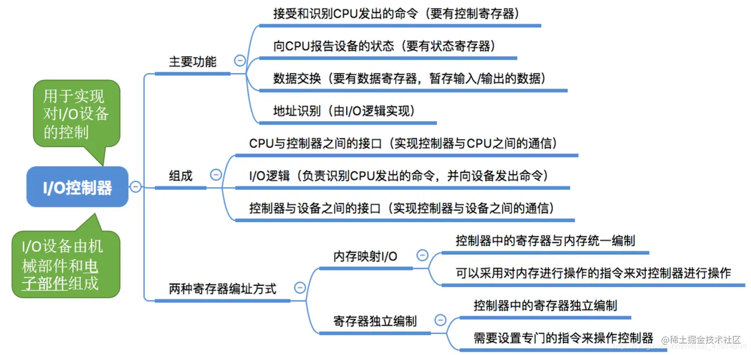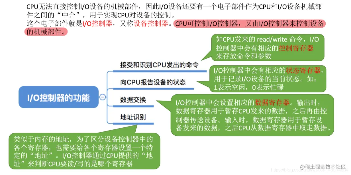 这个电子部件就是I/O控制器,又称设备控制器。CPU可控制I/O控制器,又由I/O控制器来控制设备的机械部件。