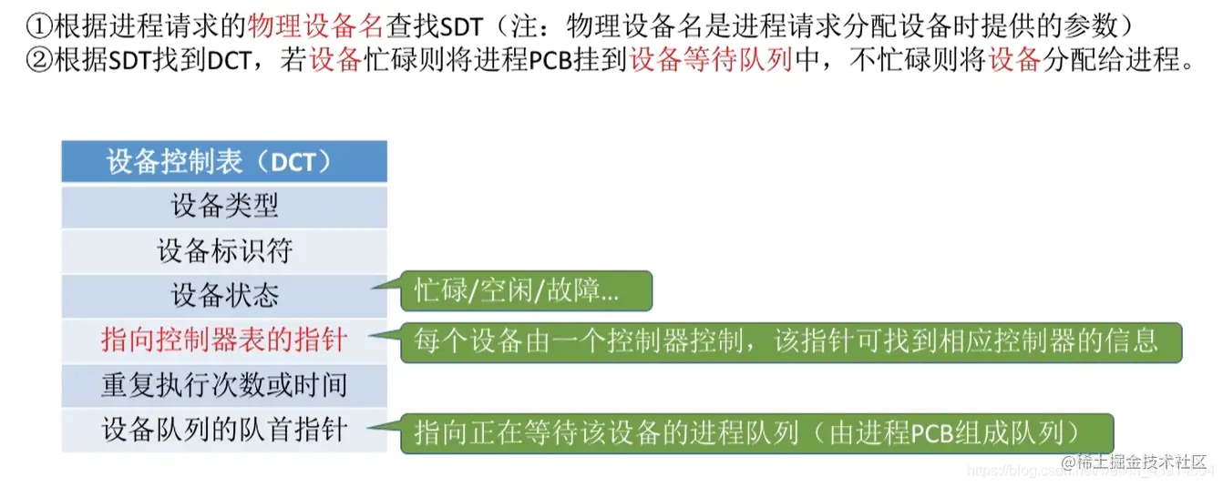 ②根据SDT找到DCT,若设备忙碌则将进程PCB挂到设备等待队列中,不忙碌则将设备分配给进程