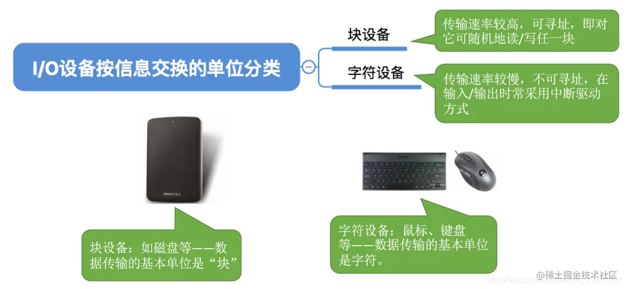 块设备:传输速率较高,可寻址,即对它可随机地读/写任一块,如磁盘等——数据传输的基本单位是“块”