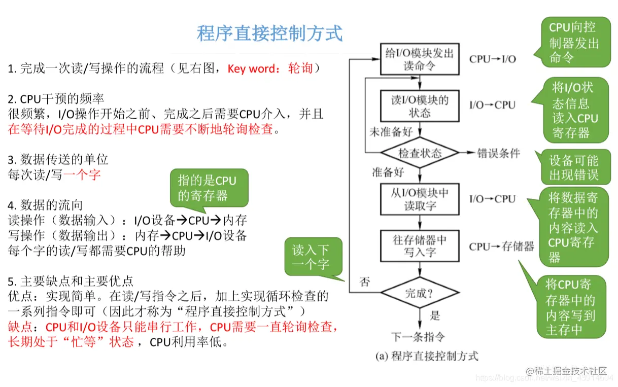 - 优点:实现简单。在读/写指令之后,加上实现循环检查的一系列指令即可(因此才称为“程序直接控制方式”)