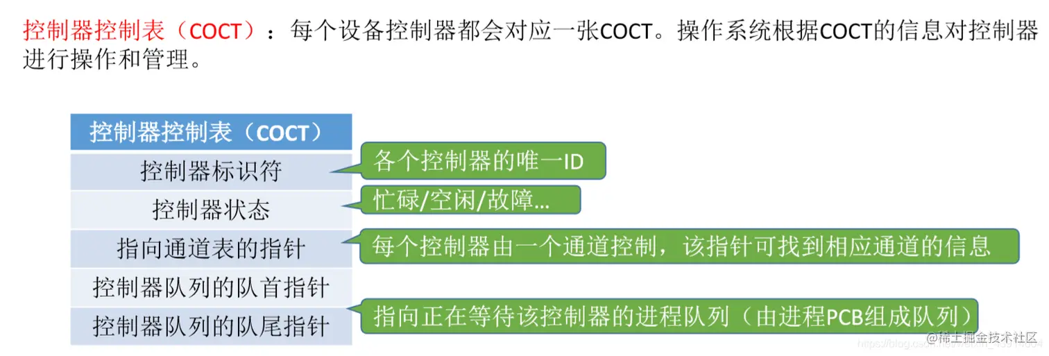 每个设备控制器都会对应一张COCT。操作系统根据COCT的信息对控制器进行操作和管理
