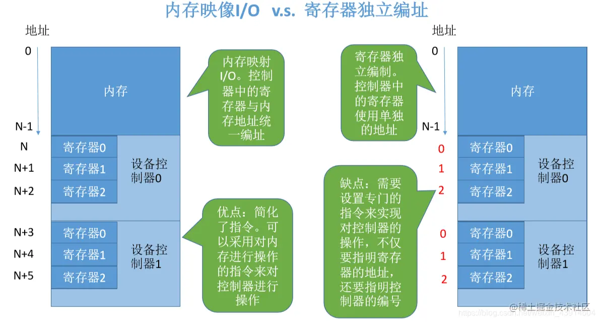 - 缺点:需要设置专门的指令来实现对控制器的操作,不仅要指明寄存器的地址,还要指明控制器的编号