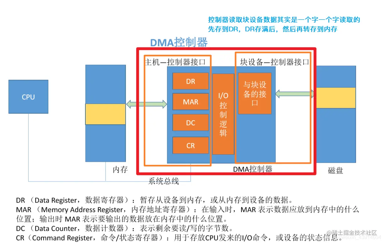 与“中断驱动方式”相比,DMA方式(Direct Memory Access,直接存储器存取。主要用于块设备的I/O控制)有这样几个改进: