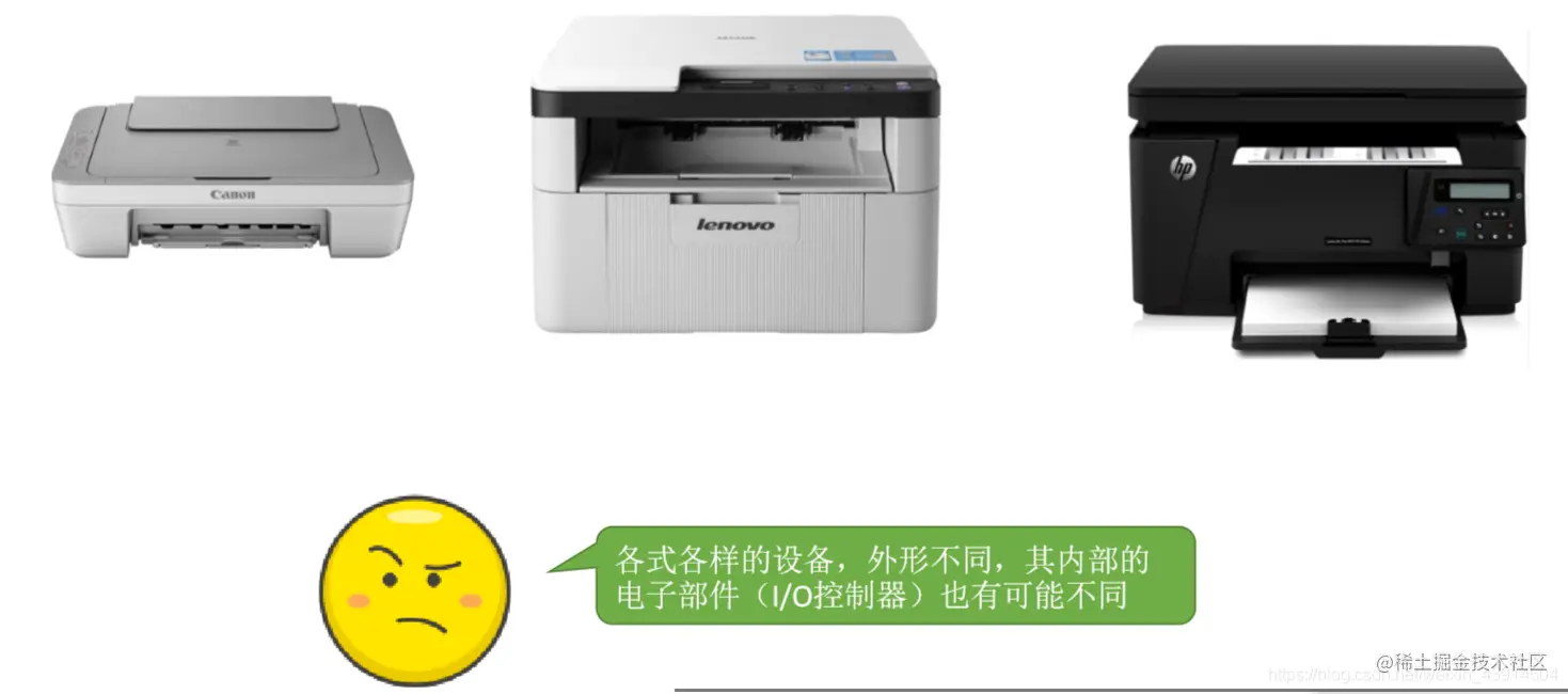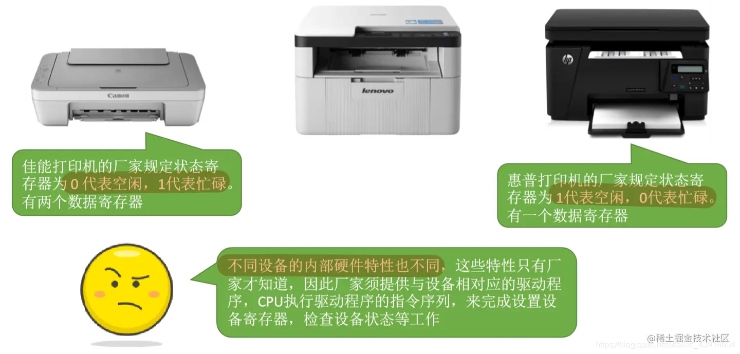 值得注意的小细节:①一个I/O控制器可能会对应多个设备;②数据寄存器、控制寄存器、状态寄存器可能有多个(如:每个控制/状态寄存器对应一个具体的设备),且这些寄存器都要有相应的地址,才能方便CPU操作。有的计算机会让这些寄存器占用内存地址的一部分,称为内存映像I/O;另一些计算机则采用I/O专用地址,即寄存器独立编址。