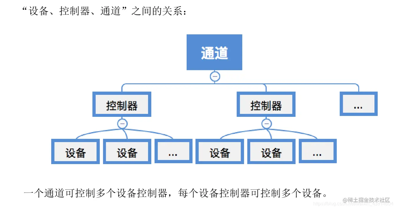 一个通道可控制多个设备控制器,每个设备控制器可控制多个设备